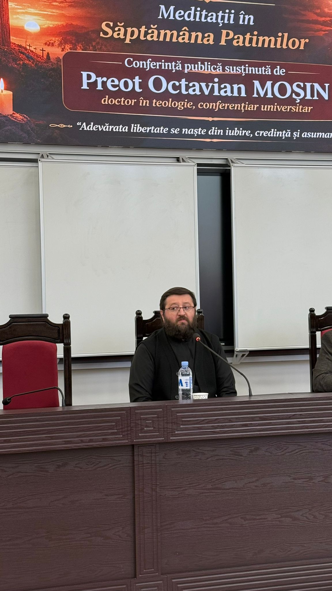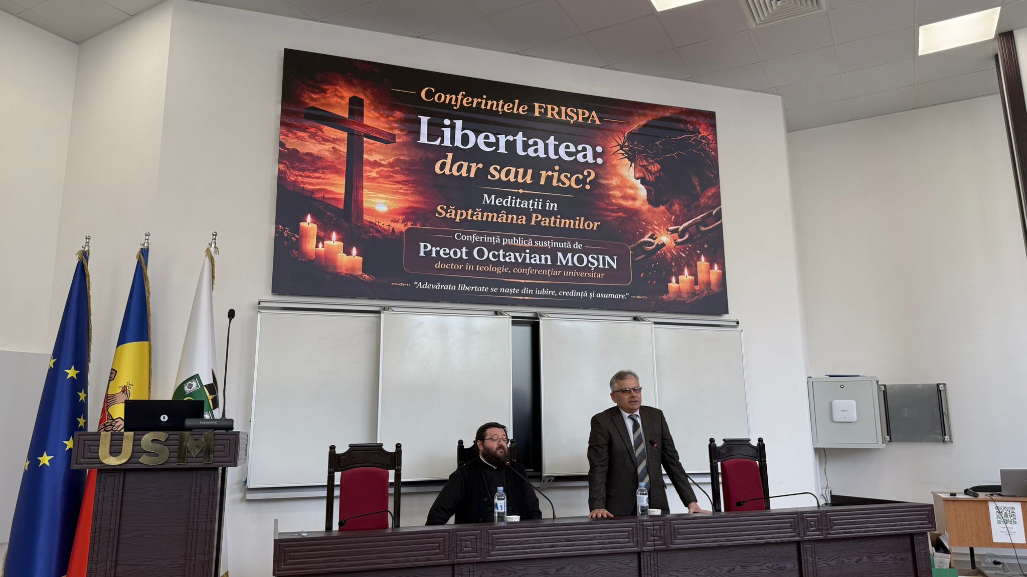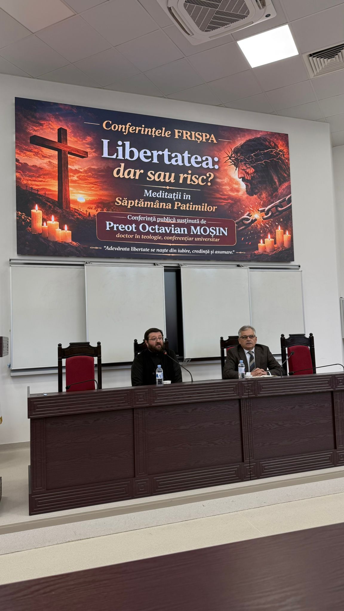 Invitatul special, preotul Octavian Moșin, doctor în teologie și conferențiar universitar, a susținut lecția publică intitulată: „Libertatea: dar sau risc”, din cadrul seriei de evenimente Conferințele FRIȘPA – Meditații în Săptămâna Patimilor.